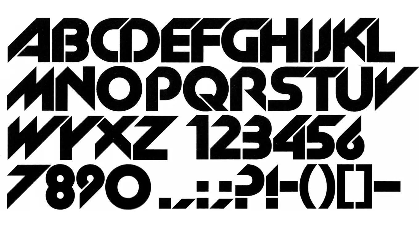 Монументальный и статичный шрифт. Для придания динамики используются стреловидные, разрезающие тело буквы, формы. Благодаря им он не выглядит скучно и угадывается рисунок букв.