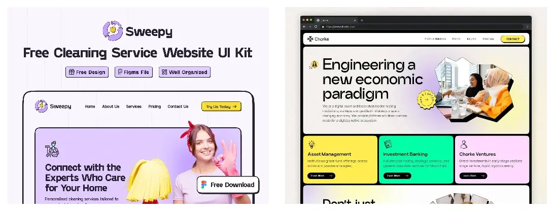 Совет: Начните с простой структуры в стиле брутализм, а затем добавьте яркие, несовершенные визуальные элементы, которые выглядят игриво и немного хаотично.