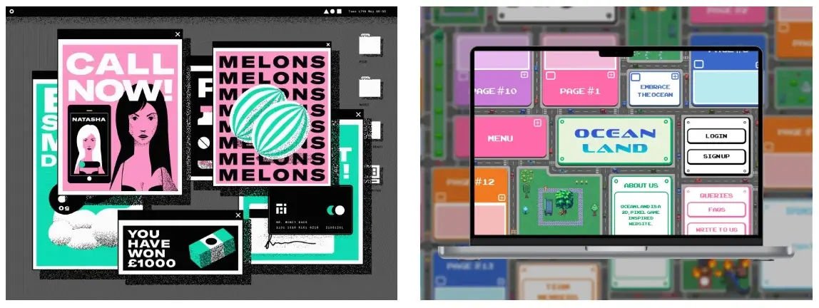 Контраст между простотой брутализма и «конфетной», милой эстетикой позволяет создавать веб-сайты, которые выглядят одновременно хаотично и очаровательно. Такой несовершенный, позитивный, визуально перегруженный дизайн превращает опыт взаимодействия в онлайн-эквивалент перелистывания небрежного, покрытого наклейками скрапбука.