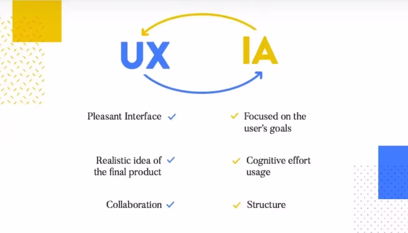 UX намного шире и включает в себя несколько аспектов, к которым информационная архитектура не имеет никакого отношения — например, создание визуально привлекательного интерфейса и учет определенных психологических потребностей пользователей. В отличие от этого, информационная архитектура гораздо больше ориентирована на цели пользователей и распределение когнитивной нагрузки.
