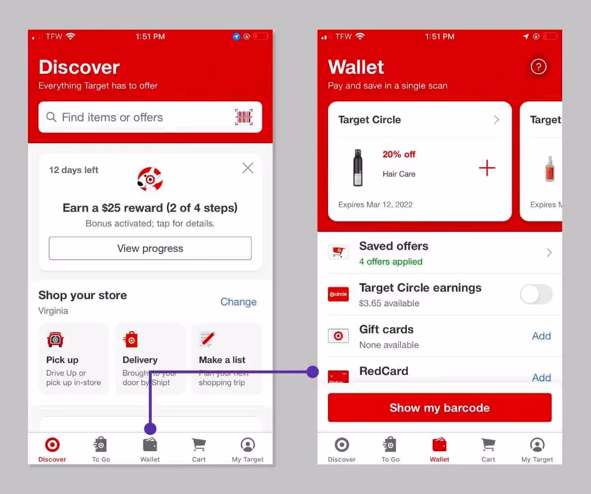 Меню с иконками в мобильном приложении Target помогает пользователям быстро переключаться между разными задачами: совершать покупки, просматривать корзину, менять настройки учетной записи и т.д.
