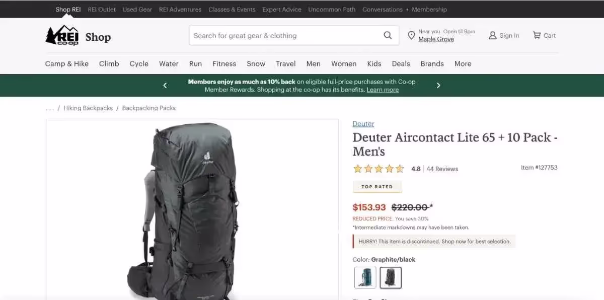 Компания REI "прячет" список доступных занятий на странице "Classes & Events" (Занятия и мероприятия) при помощи продуманных функций поиска и фильтрации. Это предотвращает чрезмерную нагрузку или путаницу, которая могла бы возникнуть, если бы вам пришлось просматривать длинный список курсов, не соответствующих вашему местоположению. Кроме того, это эффективный способ найти тот контент, который действительно интересует пользователя.