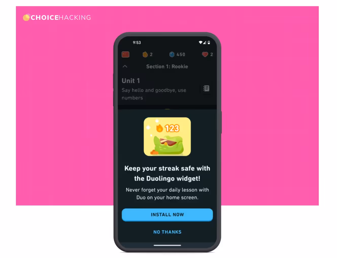 Еще один интересный триггер Duolingo — страх прервать серию. Пользователи получают сообщения (пример ниже), побуждающие их добавить специальный виджет на экран телефона. Это позволяет сделать приложение более заметным (и повышает вероятность того, что вы приступите к выполнению урока).