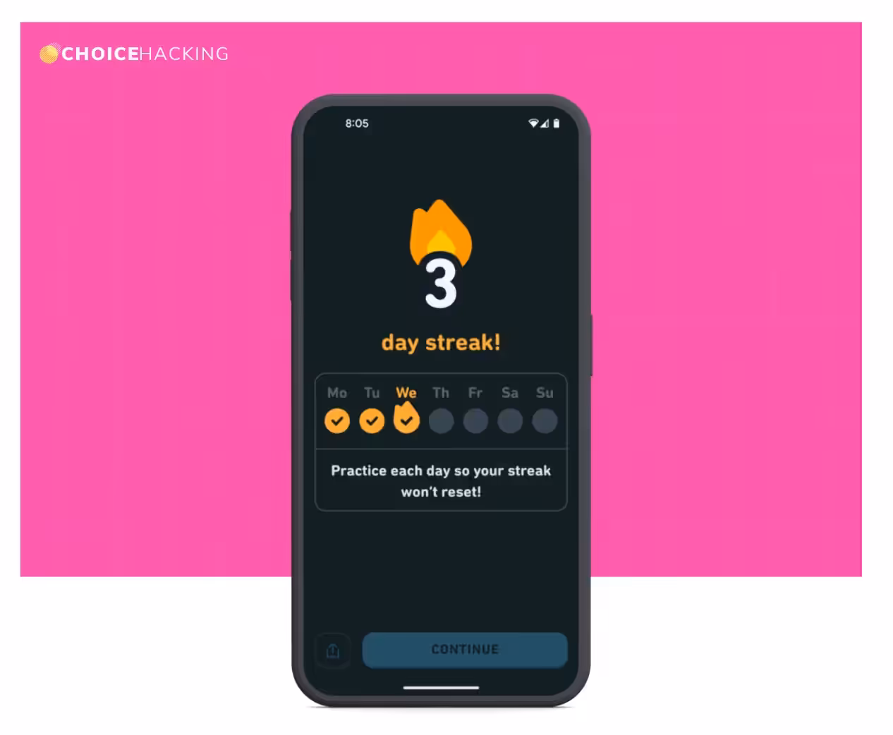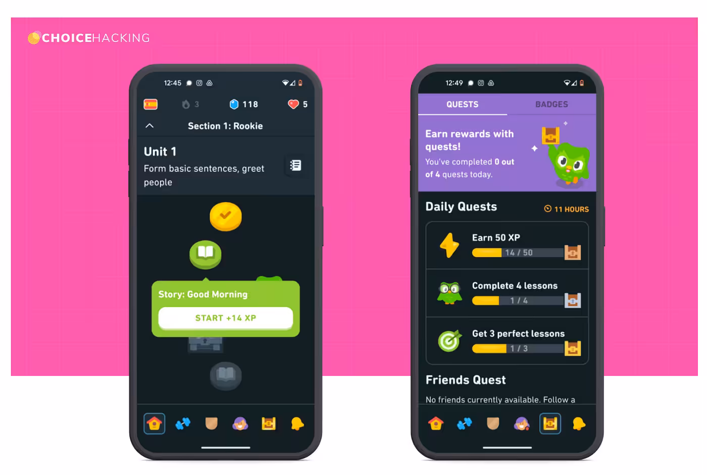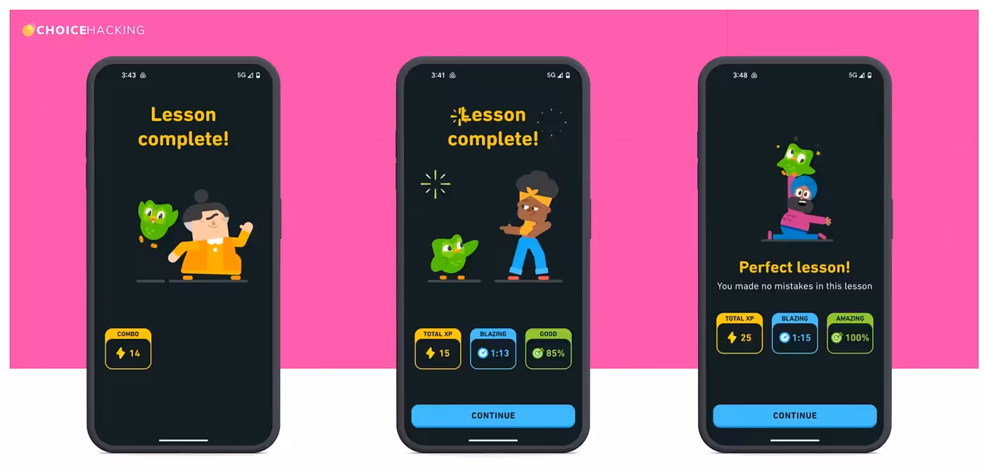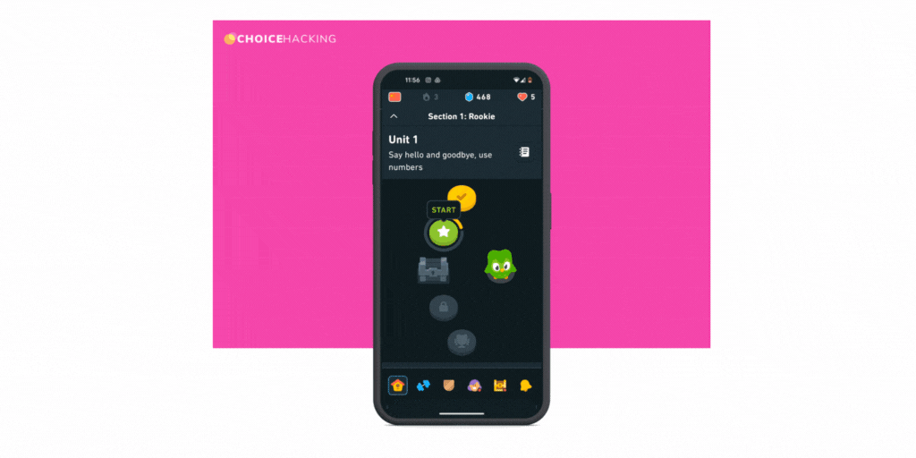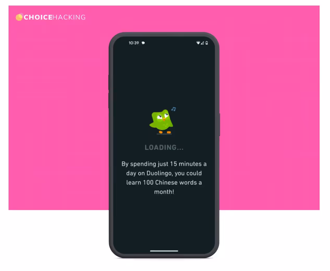 Дизайн Duolingo изобилует психологическими стратегиями, которые побуждают людей «втянуться» в изучение языка, в том числе: