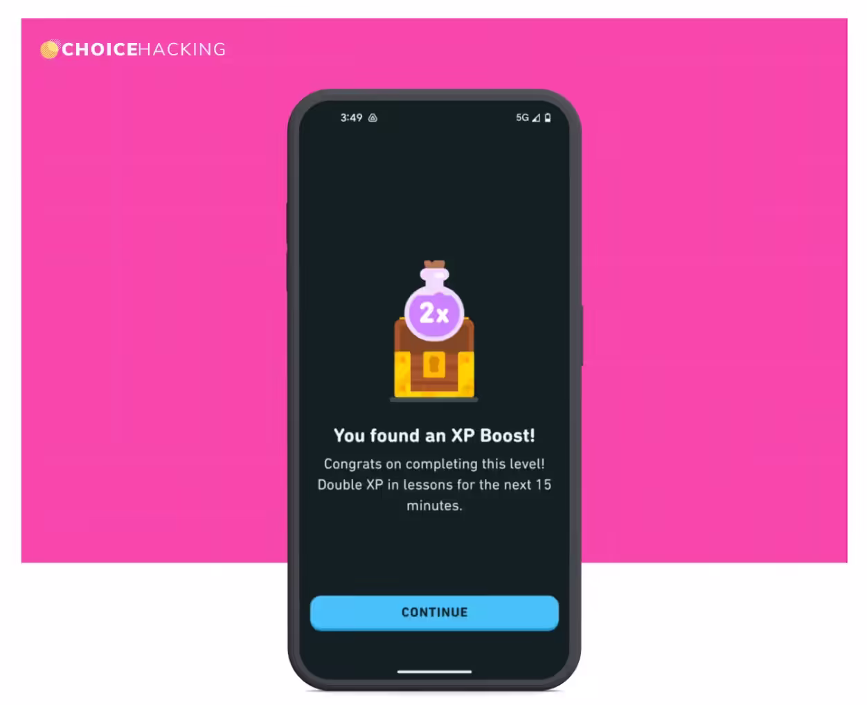 Чтобы опыт был не слишком предсказуемым, Duolingo также использует переменные вознаграждения в виде XP Boosts (повышение опыта). В течение ограниченного периода времени (например, 15 минут) количество очков опыта, которые можно получить за выполнение задания, кратно увеличивается. Это стимулирует пользователей продолжать занятия.
