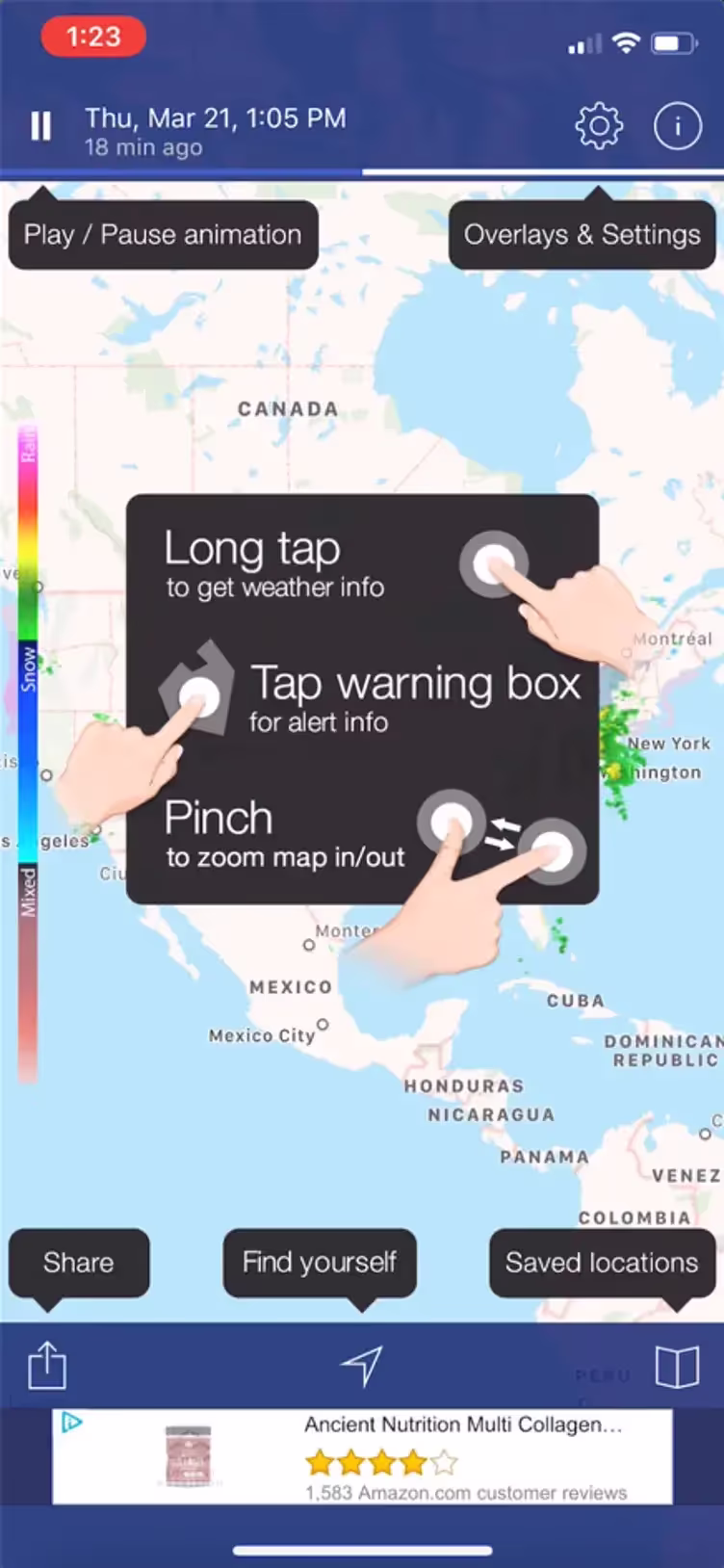 Приложение NOAA Weather перегружает пользователей, выделяя все возможные функции на одном экране. Эта реализация очень навязчива и избыточна (в случае описания стандартных элементов интерфейса, таких как иконки "Share" и "Settings").