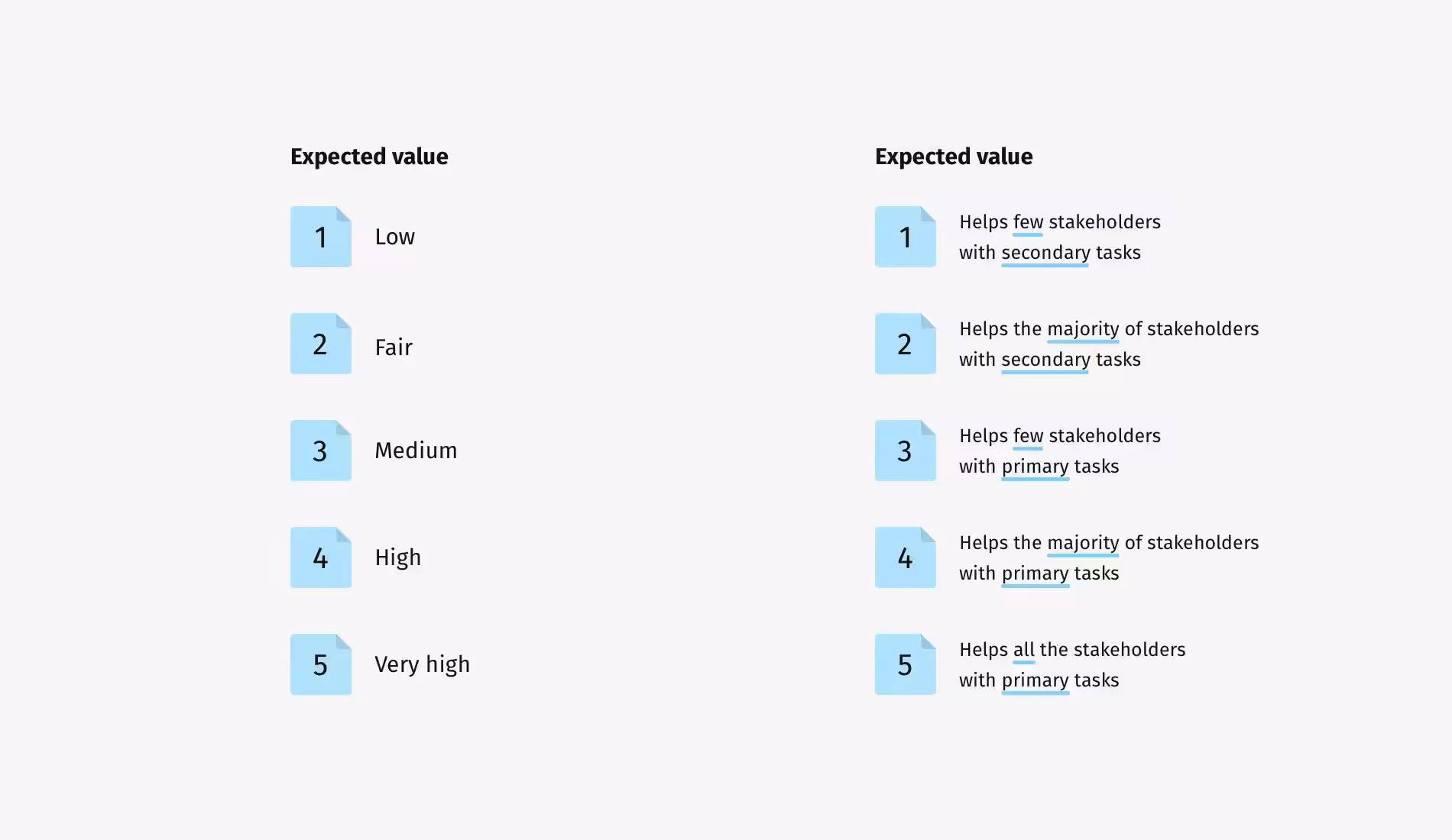 Конечно, можно было бы использовать простую шкалу от 1 до 5, где 1 представляет наименьшее значение, а 5 — наибольшее. Но это не дало бы нам четкого представления о том, что в действительности означает значение каждого элемента. Кроме того, оценивать объекты в вакууме всегда непросто. "Низкое" связано с чем? "Среднее" по сравнению с чем? Такие вопросы, несомненно, возникнут в любом случае.