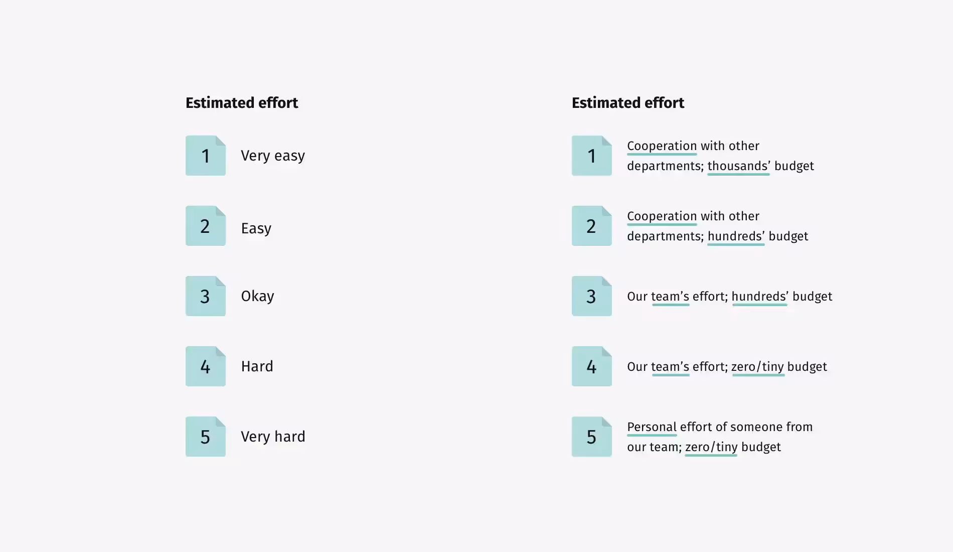Еще один пример из того же проекта: шкала оценки усилий. Опять же, мы решили добавить реальные описания. Вместо абстрактных обозначений "низкий", "средний" и "высокий", мы присвоили оценки в зависимости от того, сколько рабочей силы и денег потребуется для реализации конкретной функции. Нам известно, что фактор, который в значительной мере определит уровень требуемых усилий — это то, сможем ли мы сделать это самостоятельно или только с помощью третьей стороны.