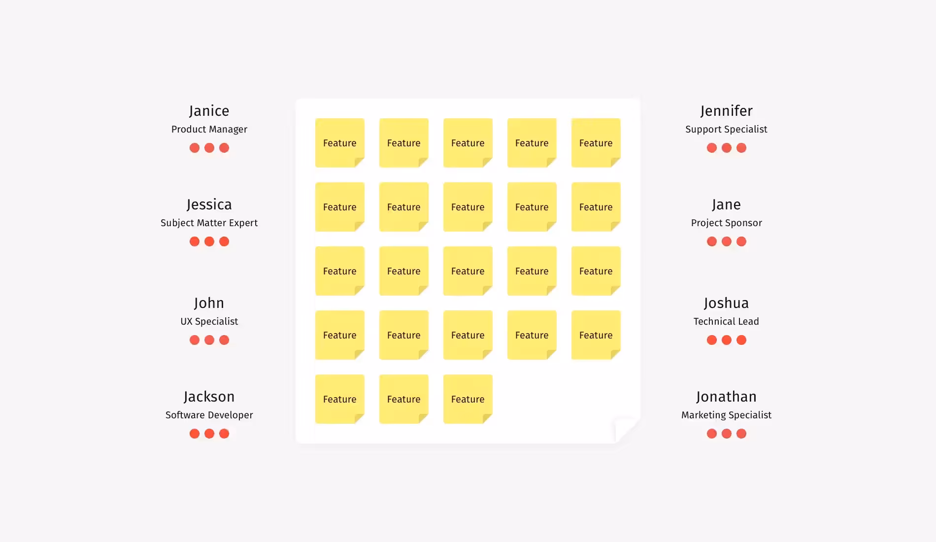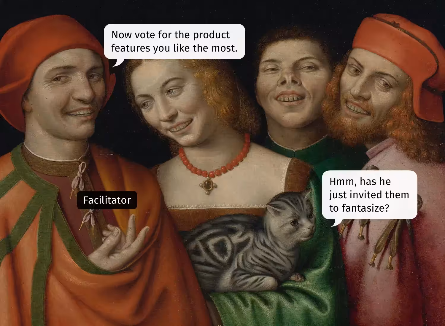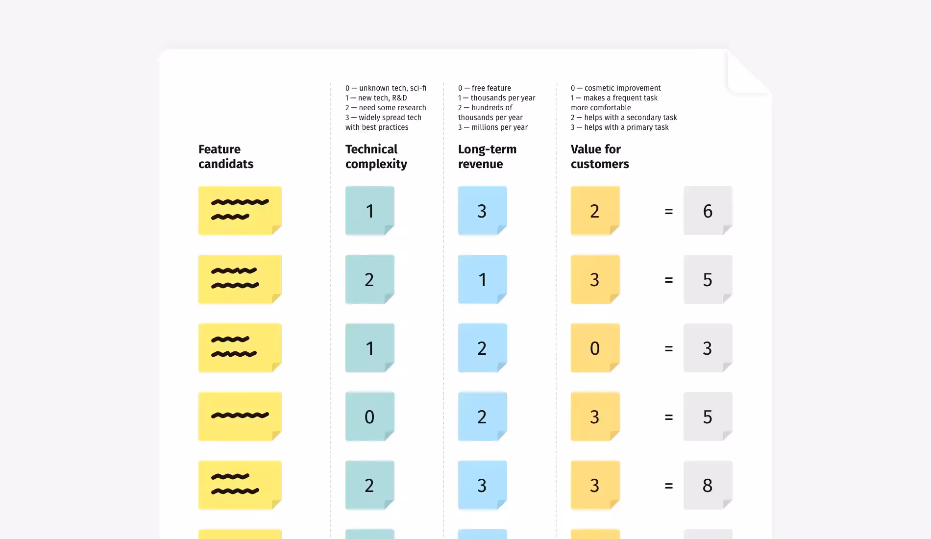 Есть одно высказывание, которое может испортить расстановку приоритетов: "Голосуйте за функции, которые вам нравятся больше всего", или вариация "Теперь выбирайте ваши любимые идеи". Эти слова открывают врата ада субъективности, и официально приглашают вашу команду фантазировать и спекулировать.