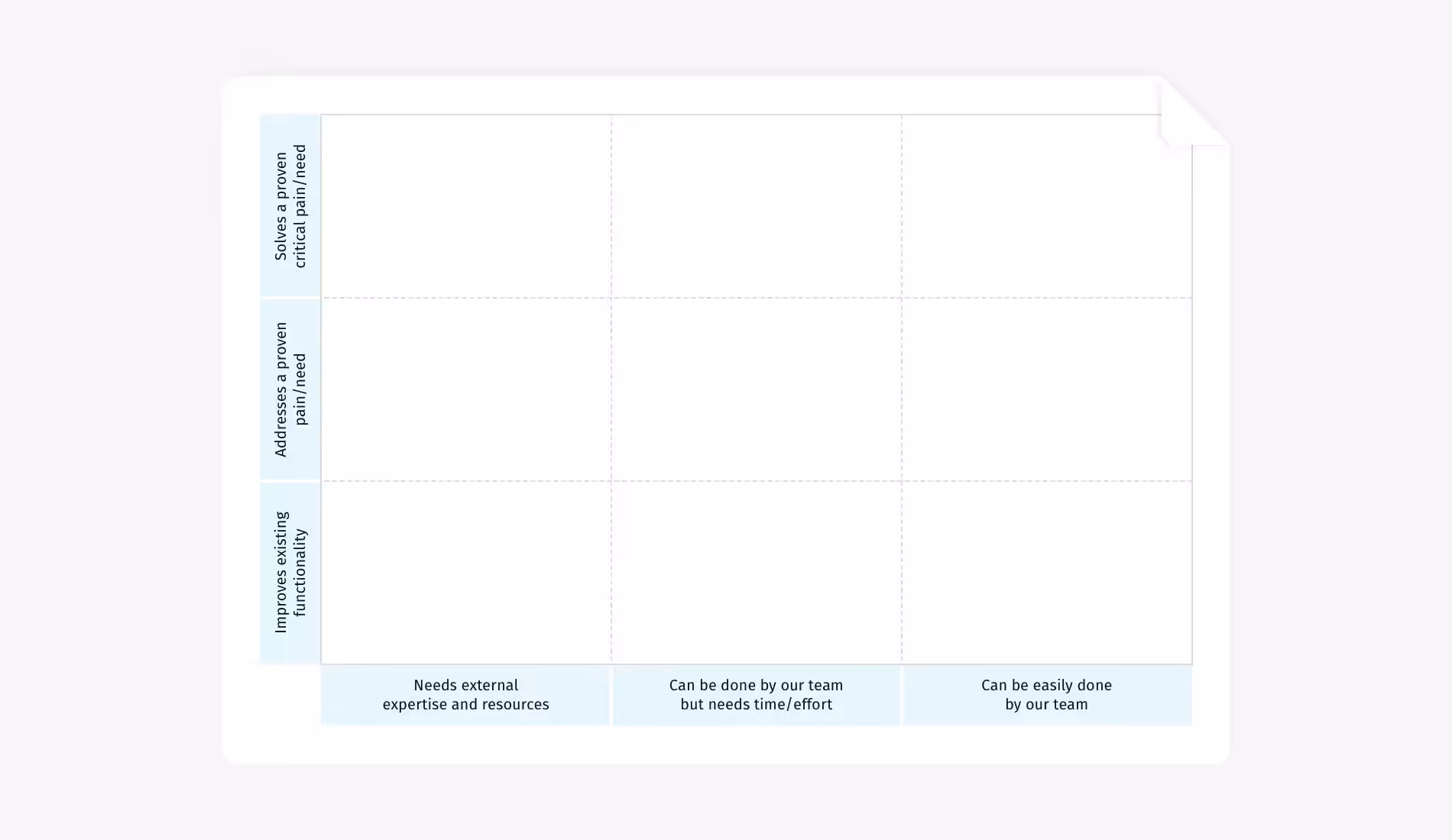 То же самое и с ожидаемой ценностью: "Решает доказанную критическую проблему" служит фильтром, который будет отсеивать идеи, не подкрепленные никакими доказательствами — будь то пользовательские исследования, запросы в службу поддержки клиентов или анализ рынка.