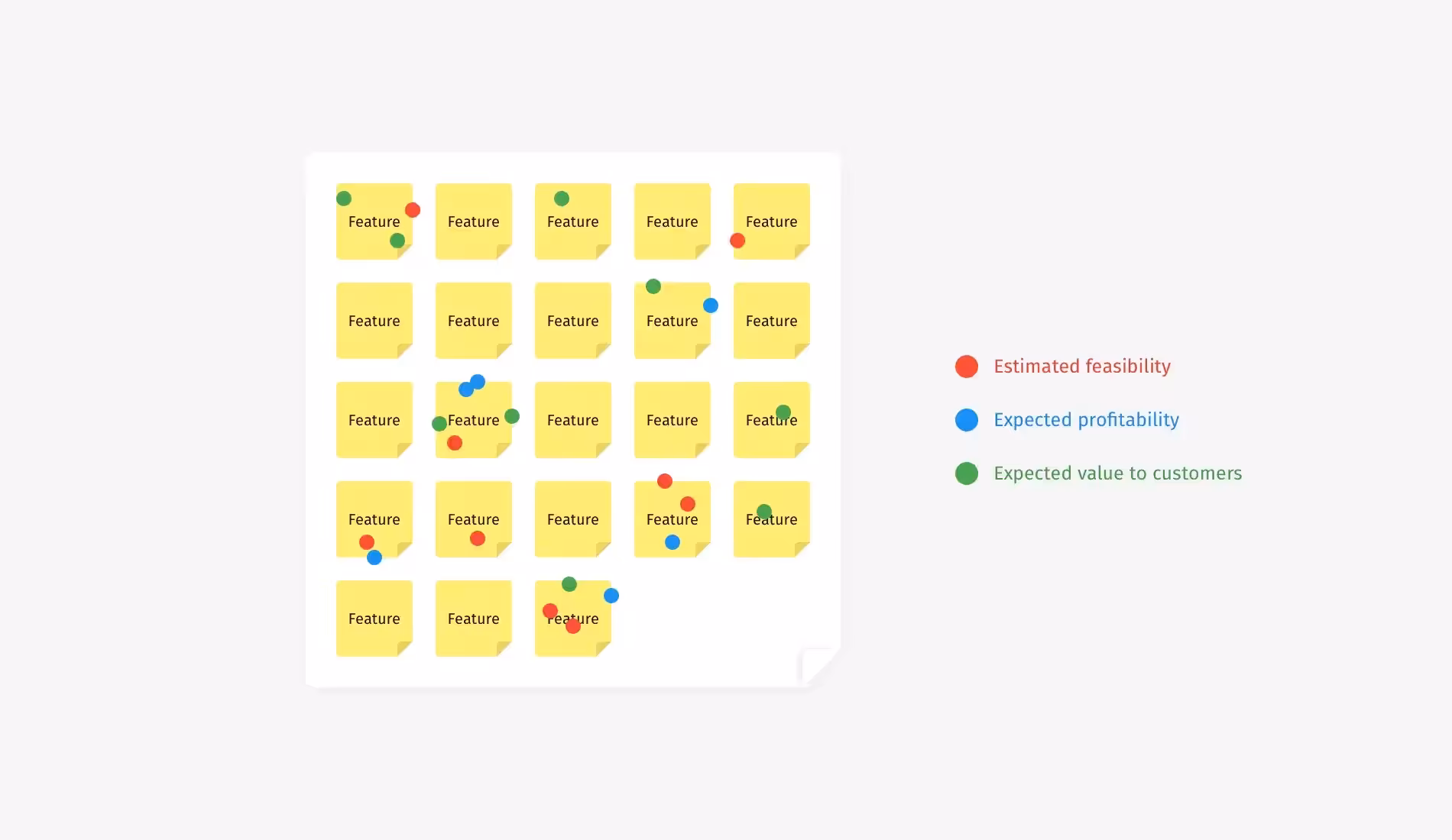 Хотя эти техники были изобретены разными людьми, по факту, они работают одинаково: члены команды размещают на доске стикеры со всеми функциональными идеями, а затем составляют шорт-лист наиболее перспективных из них. Суть в том, что участники должны оценить идеи, либо с помощью значков или голосов, либо с помощью расстановки их по осям в соответствии с тем, насколько осуществима, желательна или инновационна каждая функция.