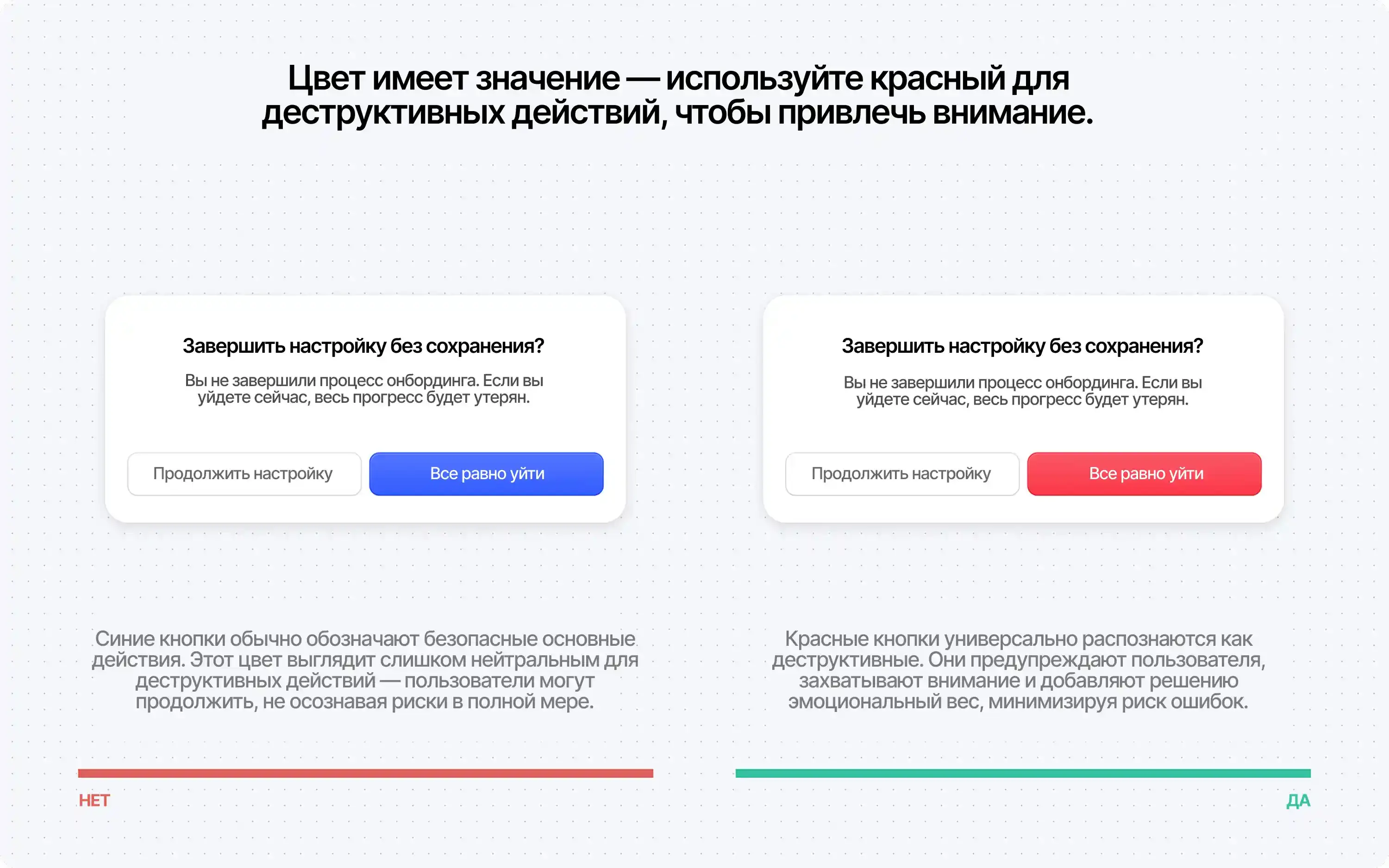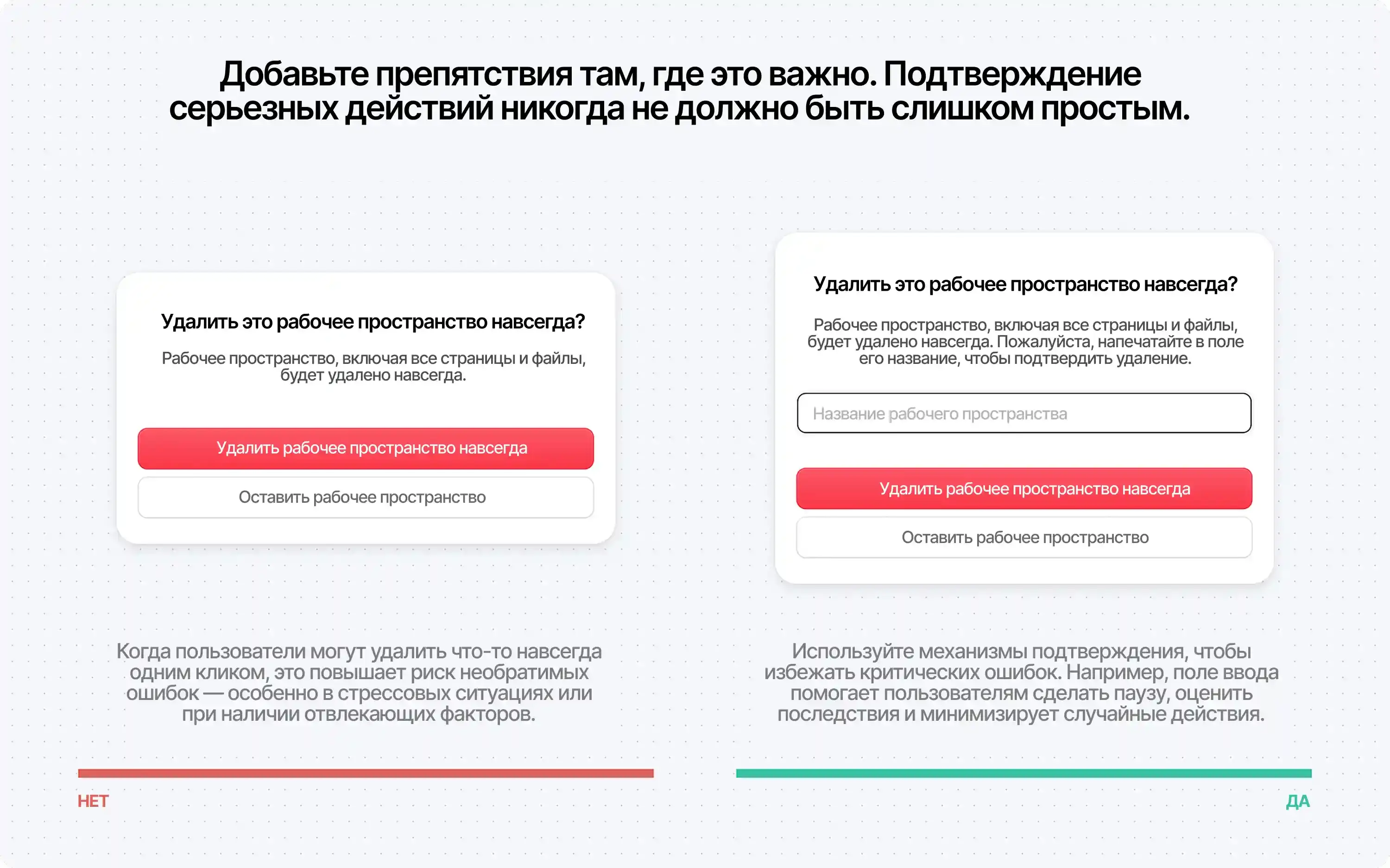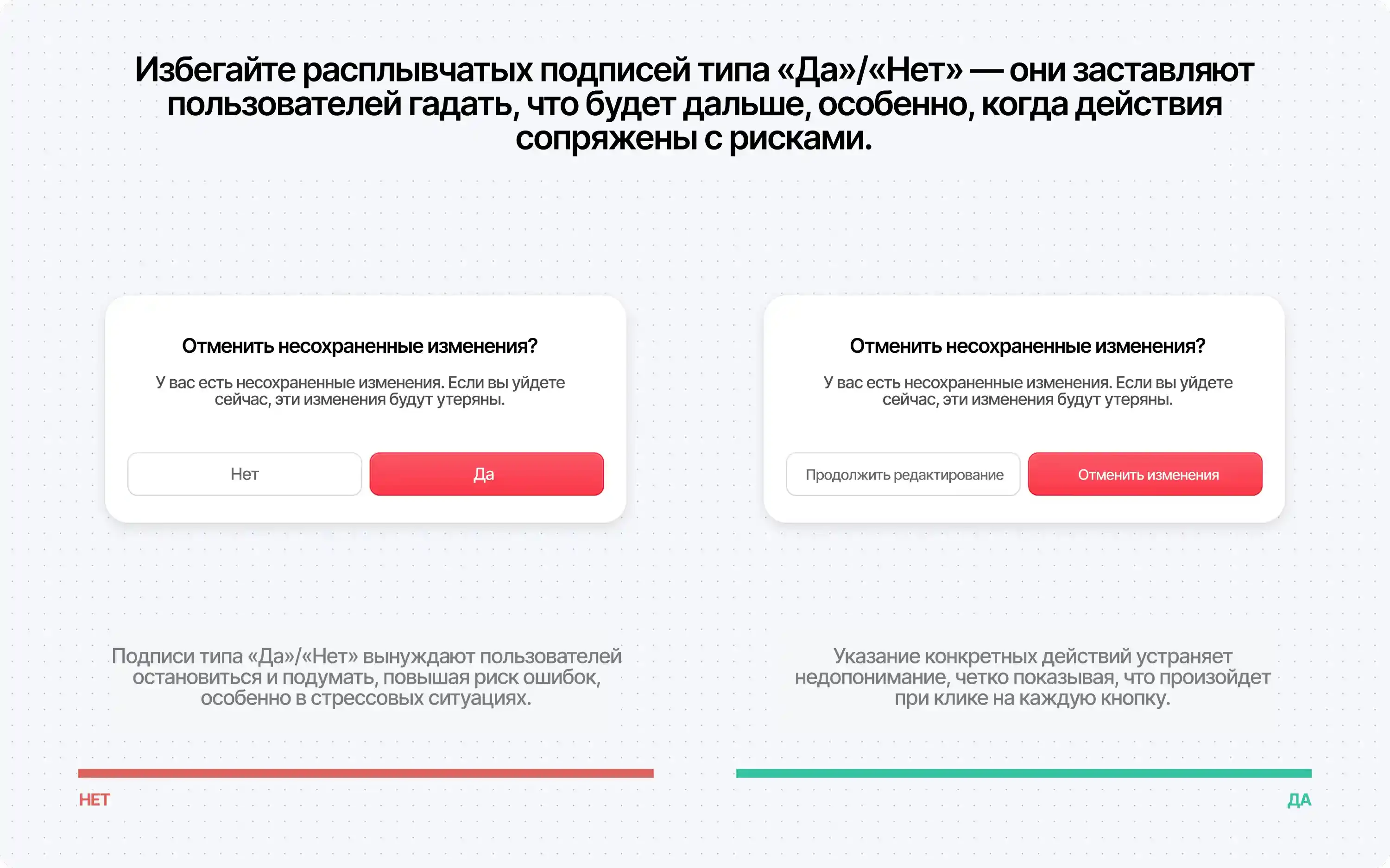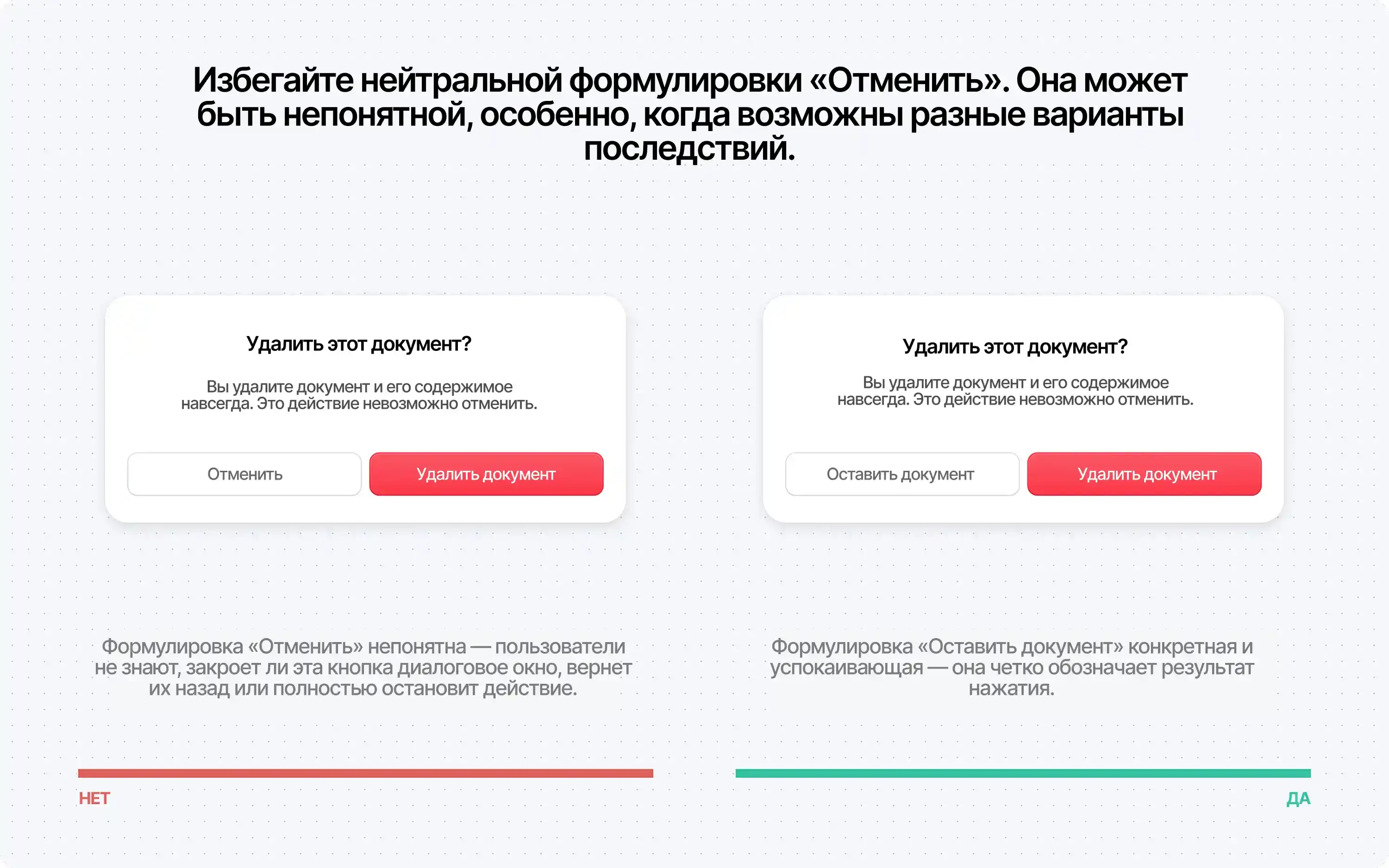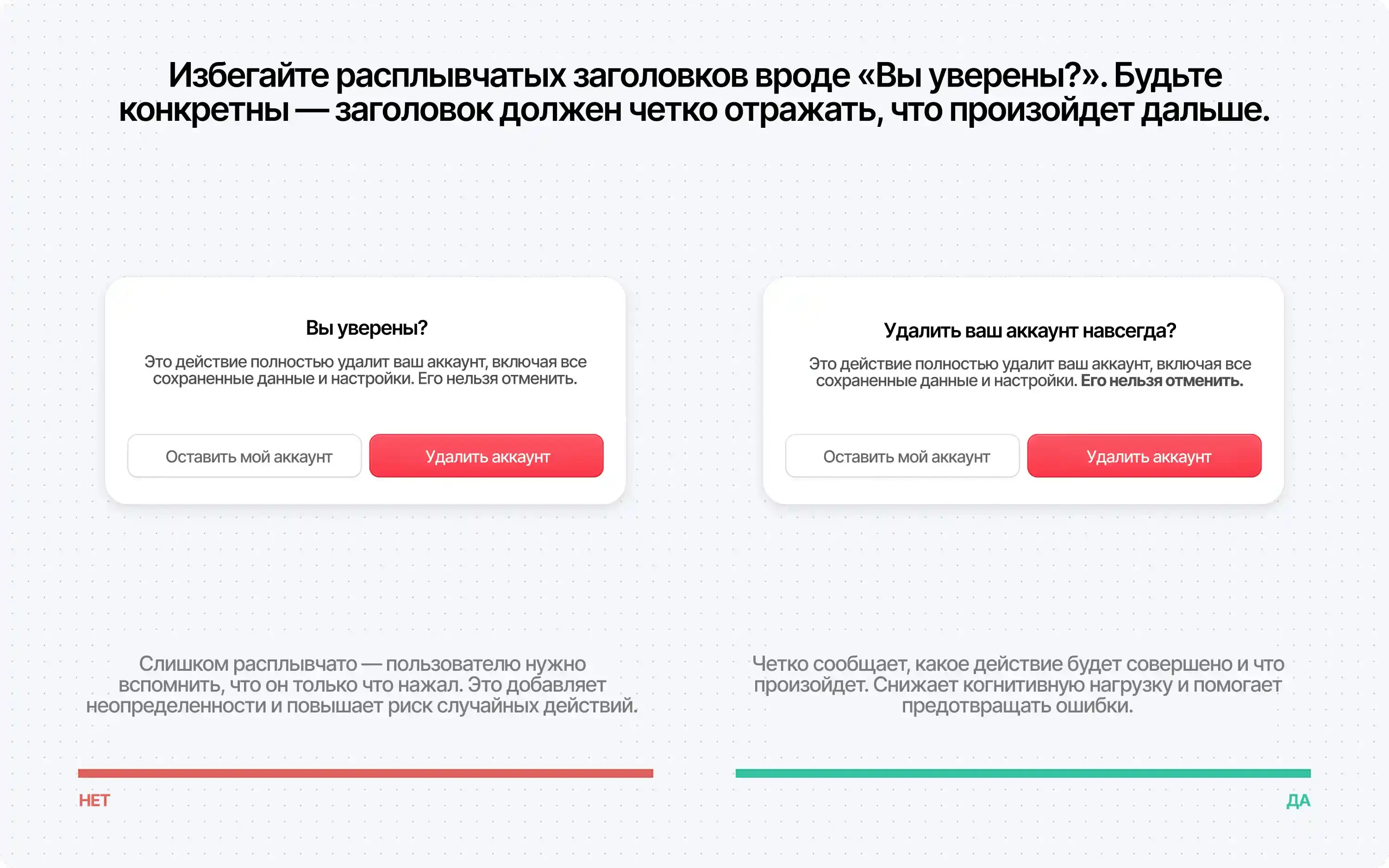 Расплывчатые формулировки вроде «Да/Нет», заставляют пользователей останавливаться и мысленно соотносить кнопки с действиями. Это может привести к ошибкам, особенно в деструктивных сценариях. Описательные подписи снижают вероятность ошибочных кликов и повышают уверенность.