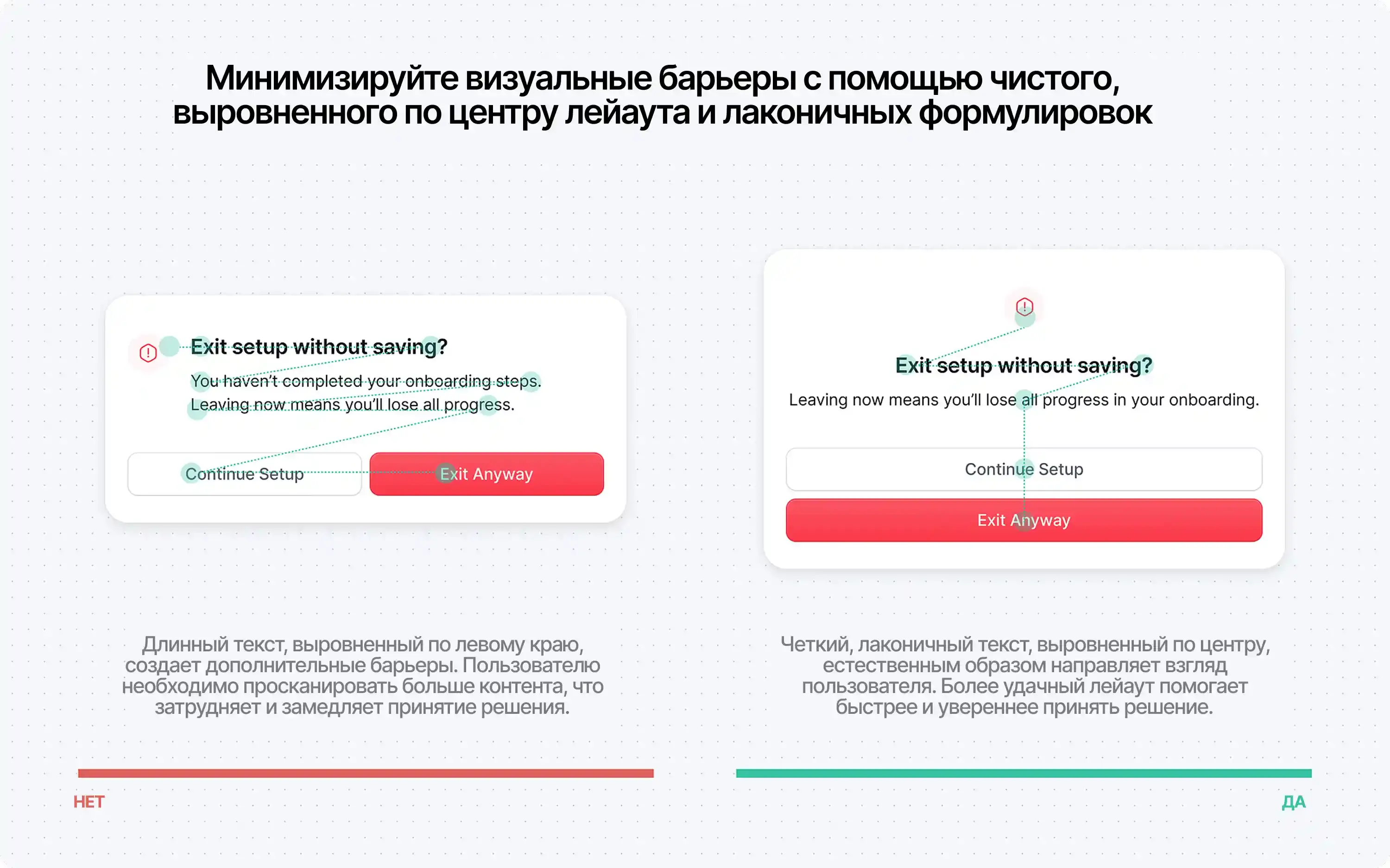 Чрезмерно сложный лейаут создает дополнительную нагрузку на глаза и замедляет когнитивную обработку информации. Чистый, выровненный по центру дизайн создает единое визуальное направление, сводя к минимуму саккады (быстрые движения глаз) и позволяя пользователям обрабатывать содержимое диалогового окна как единое целое, а не фрагментарно.