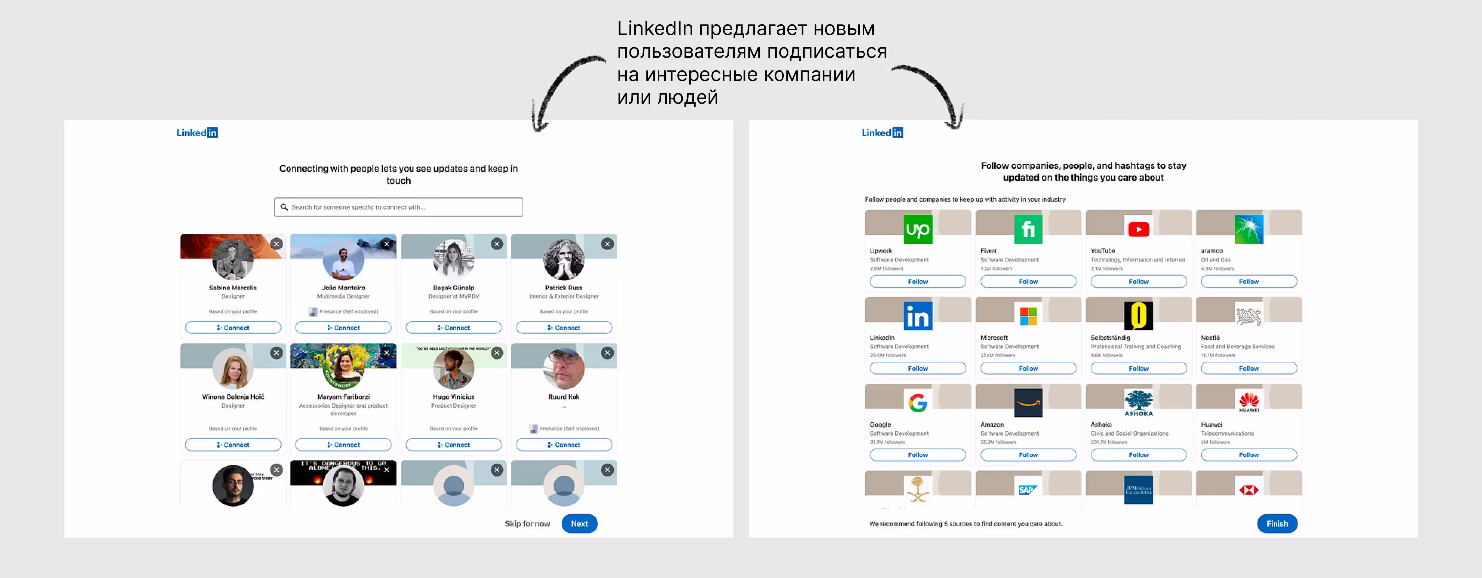 Например, главная ценность, которую предоставляет LinkedIn, — поиск работы через свои контакты. Поэтому после регистрации платформа рекомендует вам подписаться на максимальное число компаний и людей, чтобы у вас сформировалась привычка ей пользоваться.