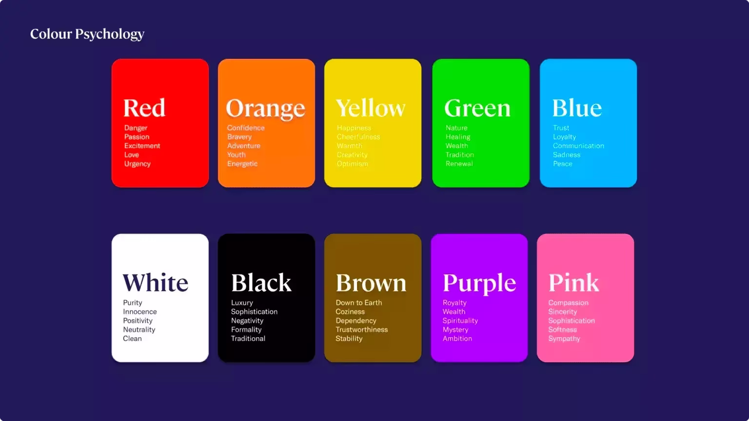 Эмоции трудно передать универсально. Однако, зная свою целевую аудиторию и своих клиентов, вы можете сфокусироваться на конкретных оттенках и поиграть с ними. Вот (неполный) список эмоций, вызываемых цветами в западной культуре.
