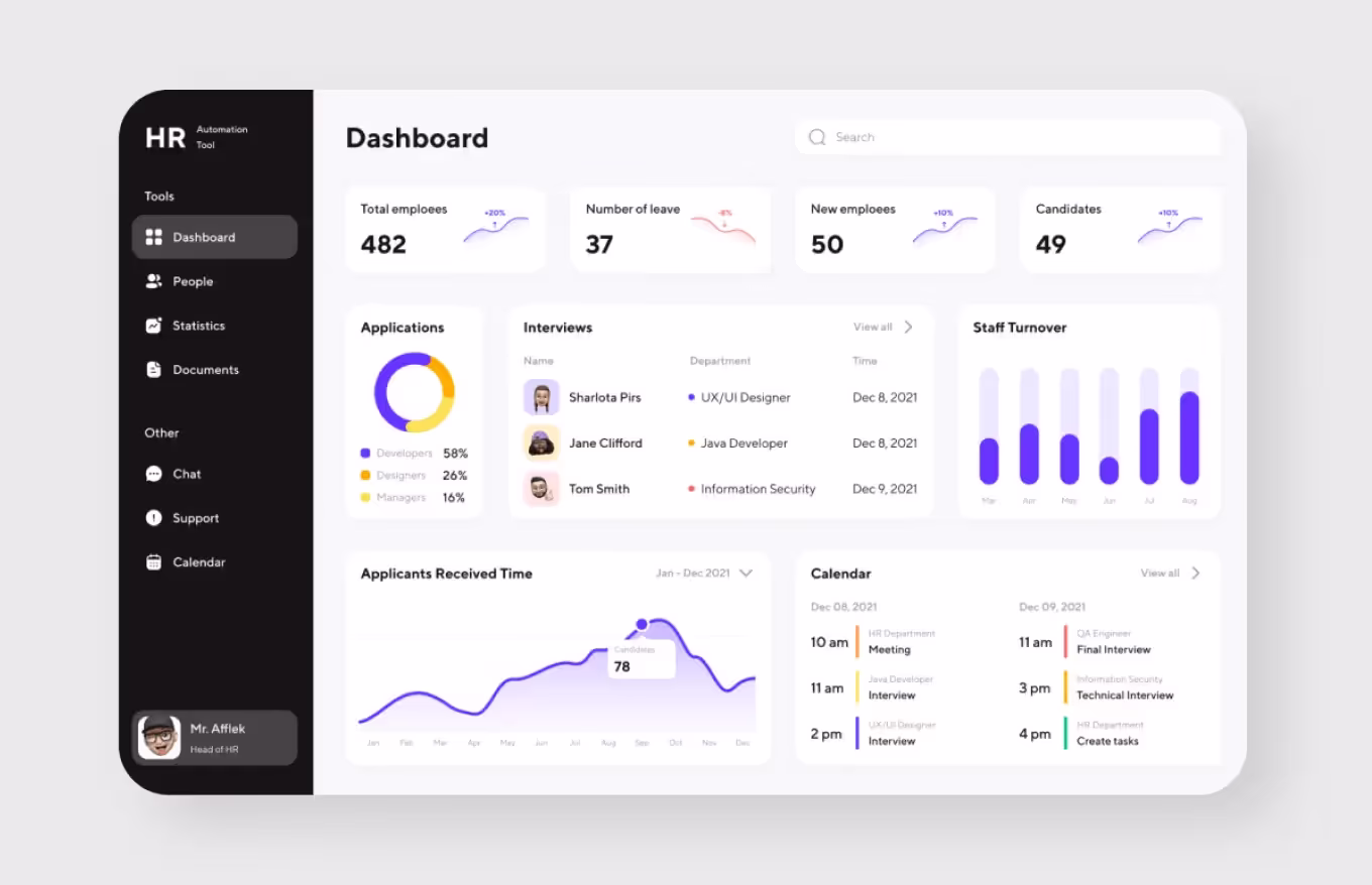 Мы видим отсутствие информационной и цветовой перегрузки. Использованы всего три цвета, а все нужные цифры на экране видны сразу. Как мы уже поняли, хороший дашборд помогает быстро принимать решения. Тут благодаря круговой диаграмме специалист сразу может увидеть соотношение кандидатов и принять нужное решение в случае нехватки кадров в одной из категорий. Справа мы можем увидеть наглядный список запланированных собеседований со всеми необходимыми данными. Все, что нужно специалисту, находится у него в секундном доступе: и ситуация с кадрами, и текущие задачи. Также специалист может воспользоваться кнопкой view all, чтобы получить более развернутую информацию по каждому интересующему блоку.