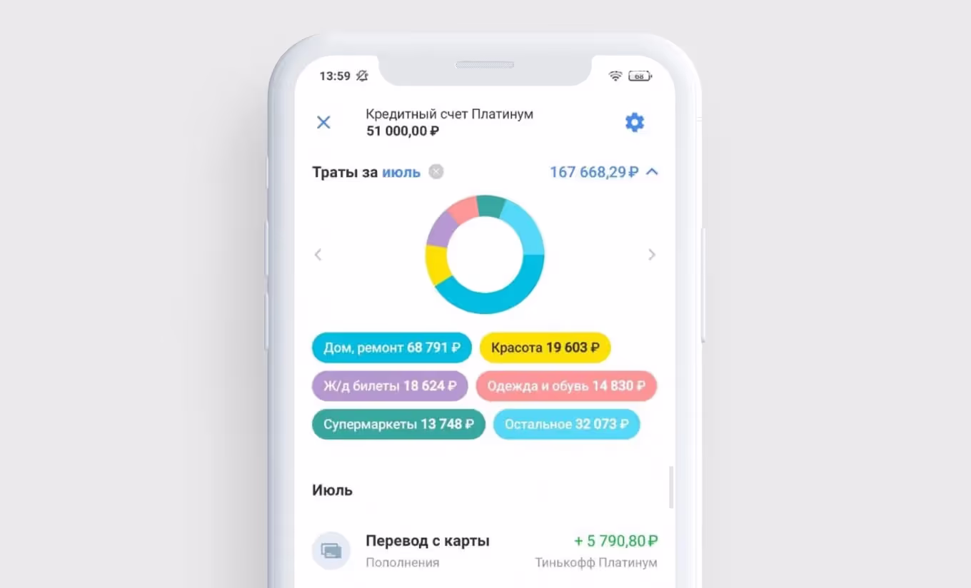 Здесь нужные показатели представлены упорядоченно и обозначены цветами, а диаграмма помогает увидеть, в какой области пользователь потратил наибольшее количество средств. Каждый цвет соответствует каждой категории трат. Подобное наглядное представление без лишних деталей помогает сразу увидеть всю нужную информацию.