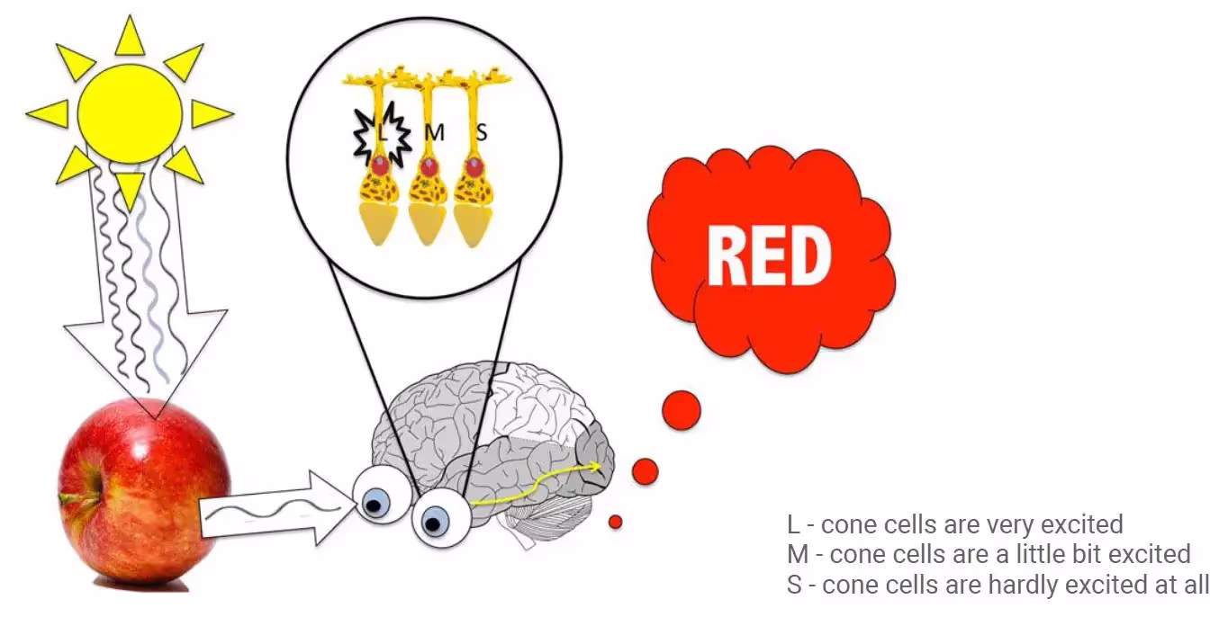 Красный цвет имеет самую длинную волну, а синий — самую короткую. Объект, воспринимаемый в красном цвете, поглощает все цвета в спектре, кроме красного света. Этот непоглощенный свет отражается обратно от объекта в глаза. Отсюда он попадает в мозг и интерпретируется как красный. Хрусталик наших глаз фокусирует приближающийся свет на сетчатку глаза, которая содержит два уникальных вида фоторецепторов: