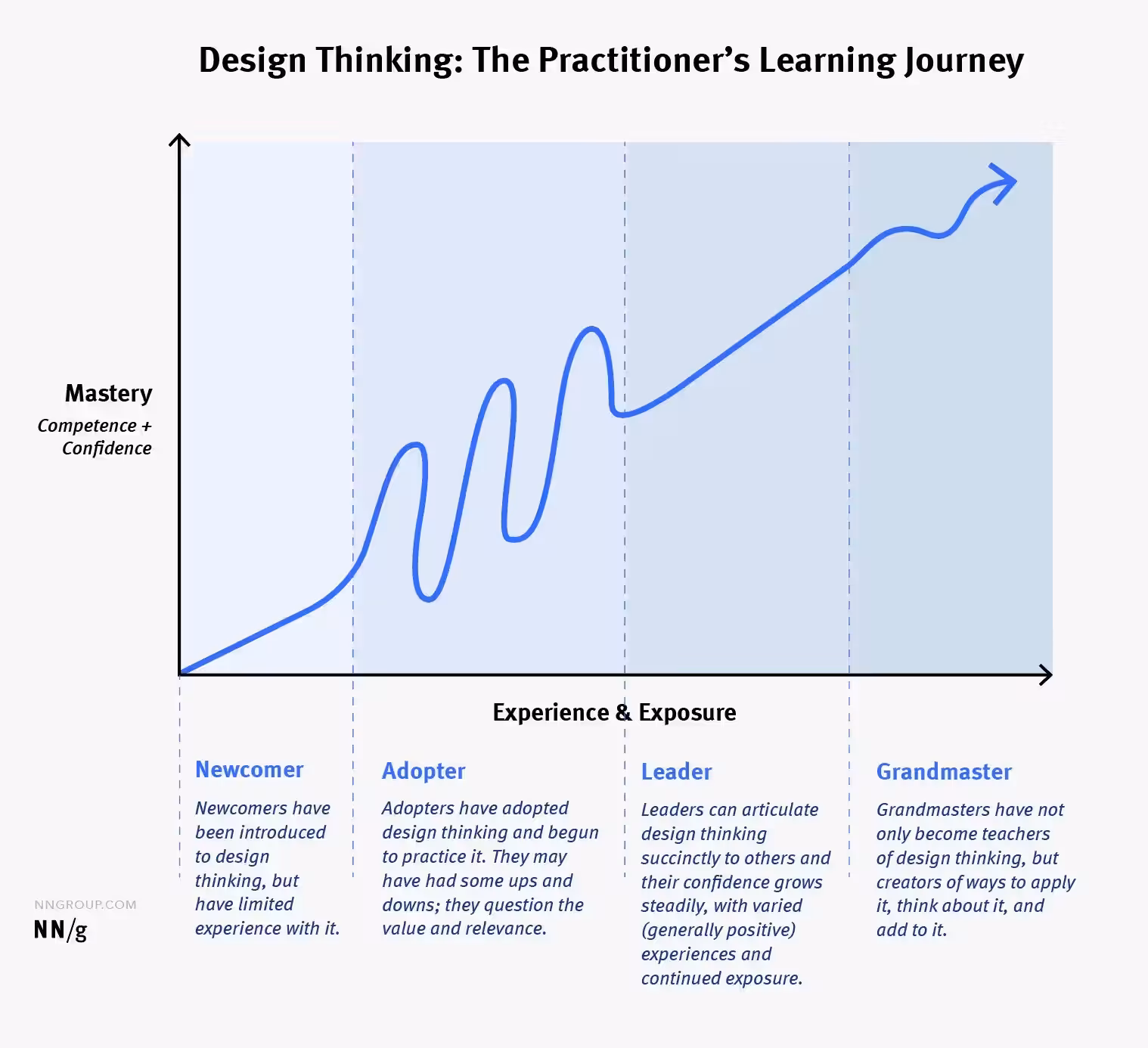 По мере того, как практикующие специалисты проходят через эти этапы, их мастерство увеличивается нелинейно, особенно из-за недостатка самоуверенности. Отметим, что мастерство — это сочетание компетентности и уверенности. И то, и другое необходимо для эффективного использования дизайнерского мышления. Если вы хорошо разбираетесь в дизайне, но при этом чувствуете себя неуверенно, то вы не сможете отклоняться от строгих шаблонов дизайн-мышления и не будете передавать свои знания другим. Если вы добьетесь равенства между компетентностью и уверенностью, то это будет означать, что вы овладели дизайнерским мышлением на должном уровне.