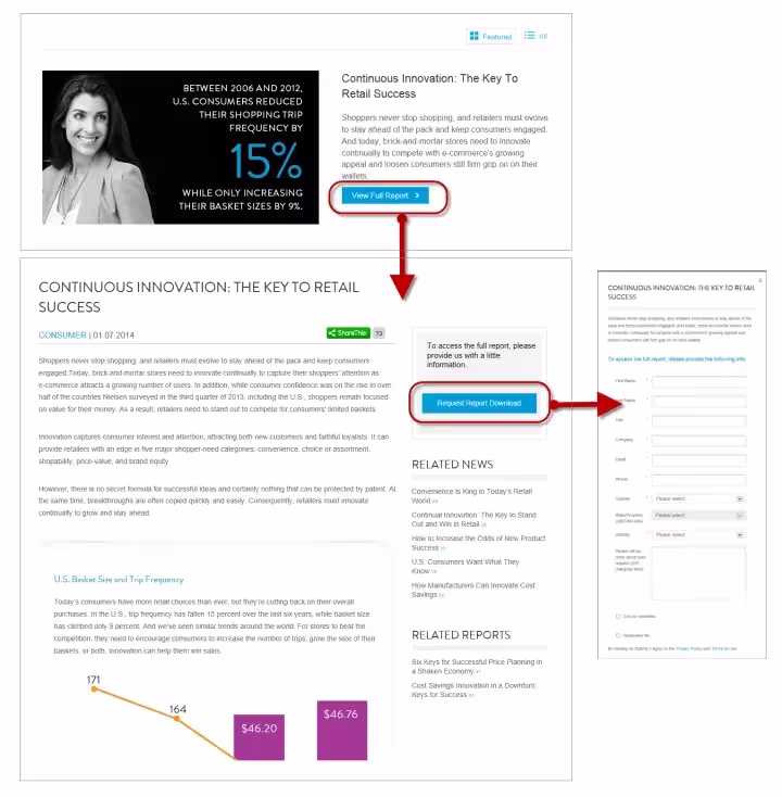Компания Nielsen использует несколько другой подход. Когда люди нажимают на кнопку “Просмотреть полный отчет”, вместо отображения формы с требованием заполнить контактную информацию сайт перенаправляет пользователей к краткой статье об отчете. Пользователи могут прочитать статью, а потом решить, хотят ли они заполнять информацию, чтобы получить отчет целиком.