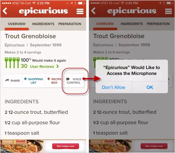Приложение Epicurious правильно запрашивает разрешение на использование микрофона только тогда, когда пользователь нажимает кнопку голосового управления. В этом контексте для пользователя логично сказать “да”, поскольку ясно, зачем приложению требуется это разрешение. Если бы приложение запрашивало его на первом экране, еще до того, как пользователь получил возможность сформировать ментальную модель того, как оно функционирует, это выглядело бы ненужным, и запрос приложения, скорее всего, был бы отклонен.