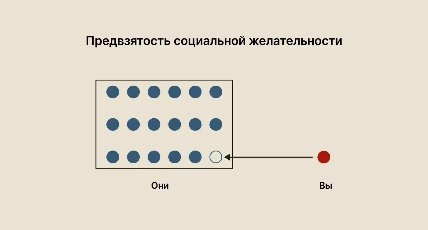 Люди подсознательно стремятся быть частью коллектива, чтобы избежать отвержения и неприязненного отношения. Во время интервью участники могут искажать информацию и менять свои ответы, чтобы не чувствовать себя неловко в присутствии интервьюера.