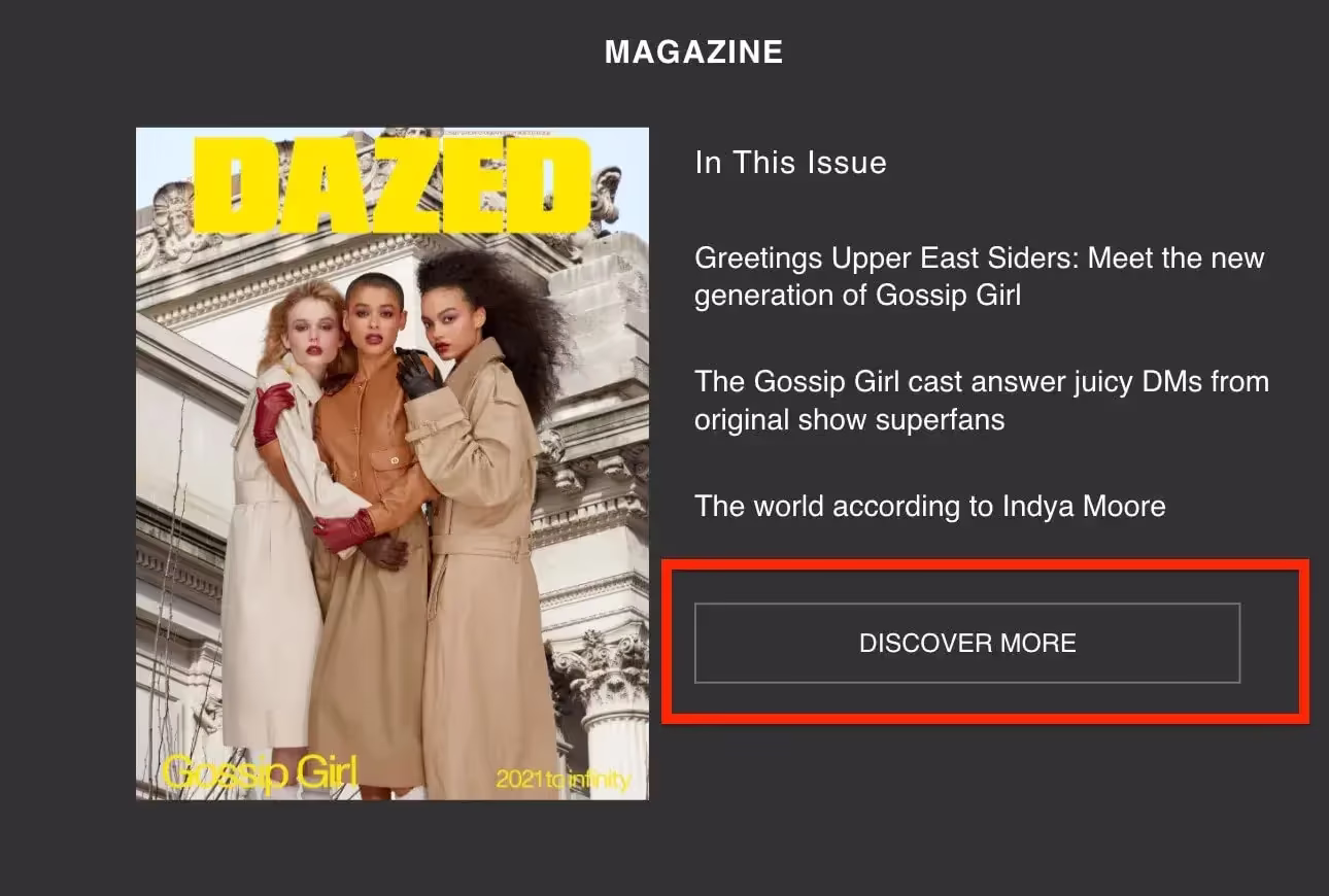 Кнопка “Узнать больше” — отличный способ подтолкнуть людей к тому, чтобы они ознакомились с вашей новой коллекцией или продуктами.