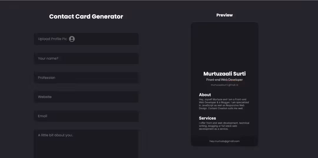 Contact Card Generator позволяет быстро создавать контактные карточки. Вам нужно только ввести нужный текст, выбрать цветовую палитру и ваша карточка готова к использованию.