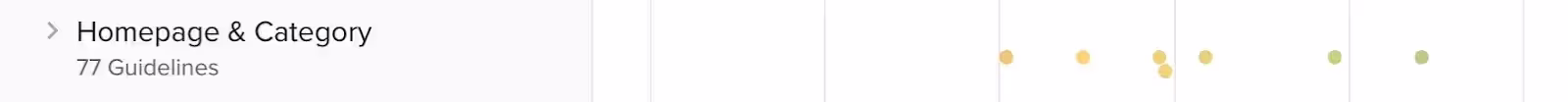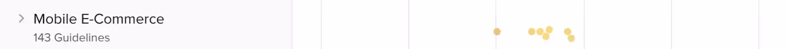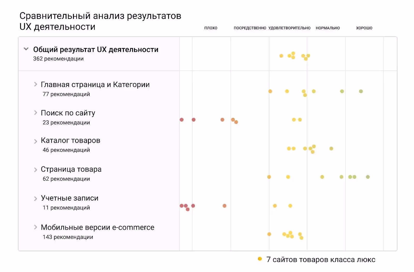 Для этого анализа было собрано более 2500 оценок юзабилити сайтов товаров класса люкс в разрезе 51 раздела. На диаграмме выше представлены 7 тестируемых сайтов товаров класса люкс. Таким образом, каждая точка представляет собой суммарную оценку UX каждого сайта. Она охватывает по 4–12 рекомендаций в соответствующем разделе. Верхняя строка — это общий результат UX деятельности сайта товаров класса люкс.