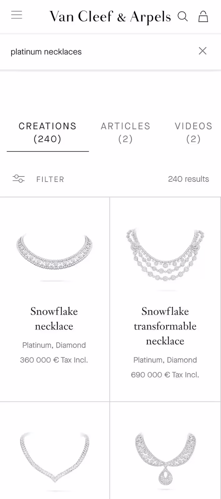 В мобильной версии сайта Van Cleef & Arpels на странице категории товара с примененным соответствующим фильтром отображается 8 товаров (первое изображение), а в результатах поиска показаны все товары (второе изображение), включая те, которые не соответствуют указанной характеристике. Это затрудняет использование поиска определенных товаров.