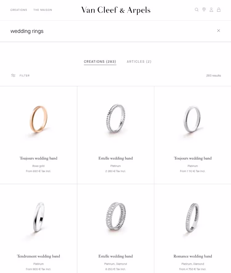 На сайте Van Cleef & Arpels правильно написанный запрос “wedding rings” (первое изображение) генерирует хорошие результаты. Однако результаты очень плохие, если запрос написан с небольшой ошибкой, например “weding rings” (второе изображение). Фактически, они почти такие же, как если бы пользователь просто написал в запросе “rings” (третье изображение). Это указывает на то, что первый неправильно написанный термин просто игнорируется поисковой системой.