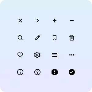 Существует 16 универсальных иконок, с которыми пользователи сталкиваются наиболее часто. Они представляют собой аффордансы (термин из книги Дона Нормана “Дизайн привычных вещей”), то есть обозначают действия, которые можно выполнять с помощью конкретного компонента.
