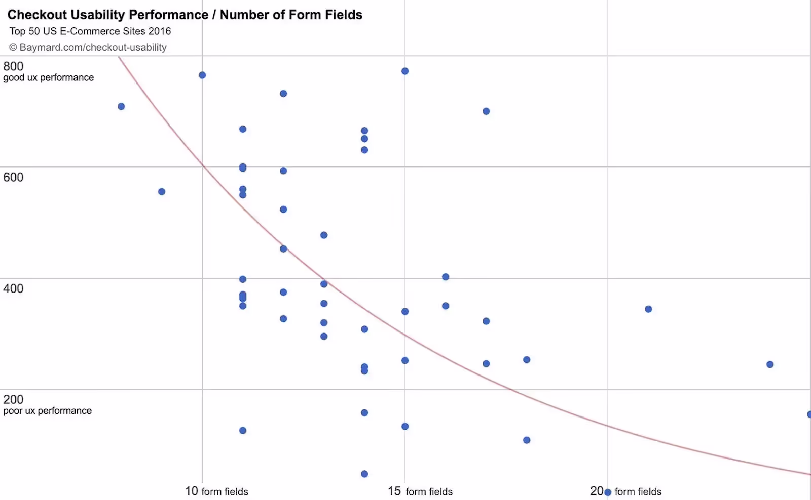 При построении графика UX-показателей оформления заказа 50-ти самых прибыльных сайтов электронной коммерции США мы видим, что существует корреляция (зависимость — красная линия), которая зависит от количества элементов формы в оформлении заказа. Эта корреляция находится в зависимости между количеством элементов формы, отображаемых по умолчанию, и общим пользовательским опытом оформления заказа (с небольшим запасом для исключений, характерных для конкретного сайта).