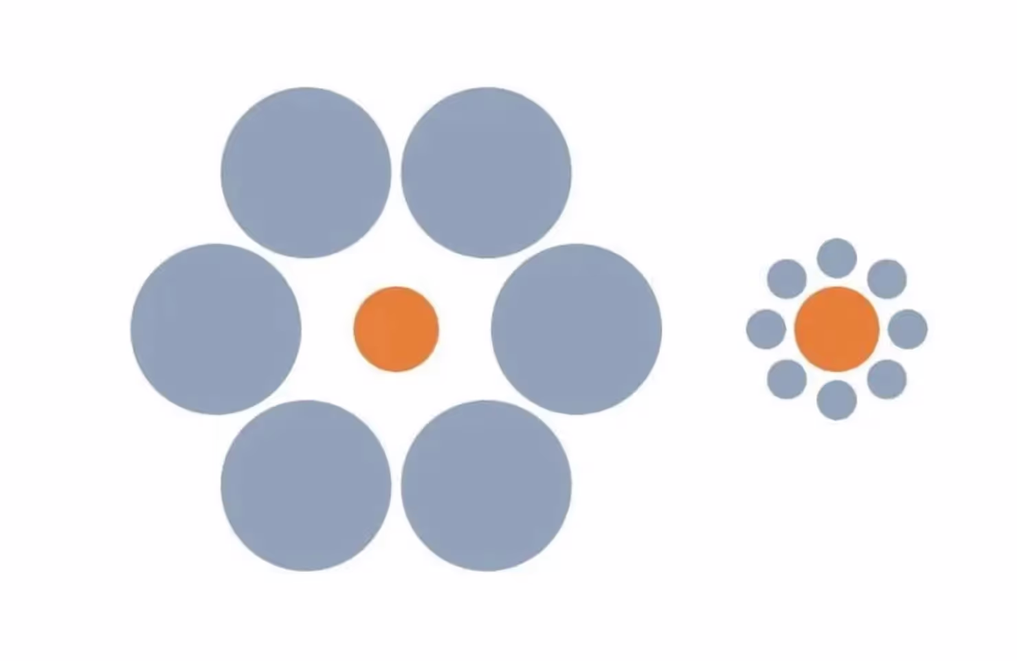 Всё дело в размере серых кругов, расположенных вокруг оранжевых. Мы оцениваем размеры объектов относительно контекста. Другое возможное объяснение — разное расстояние центрального круга до окружающих его элементов.
