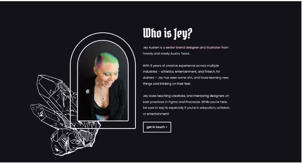 Забавные детали, такие как готический шрифт Pirata для заголовков, и уникальные изображения (кристаллы и мечи), придают интерфейсу загадочность. Джей удалось создать по-настоящему креативное и оригинальное портфолио, но с понятным и тщательно продуманным UX.
