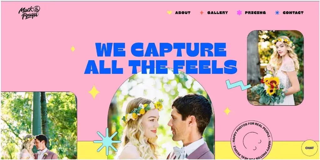 Американская компания Mack and Pouya, которая специализируется на съемке свадеб, имеет персональный веб-сайт с интересным дизайном, отражающим направление их деятельности. Согласитесь, всегда приятно видеть такие красочные примеры веб-сайтов, которые не боятся выделяться с помощью смелых цветовых сочетаний и креативного дизайна.
