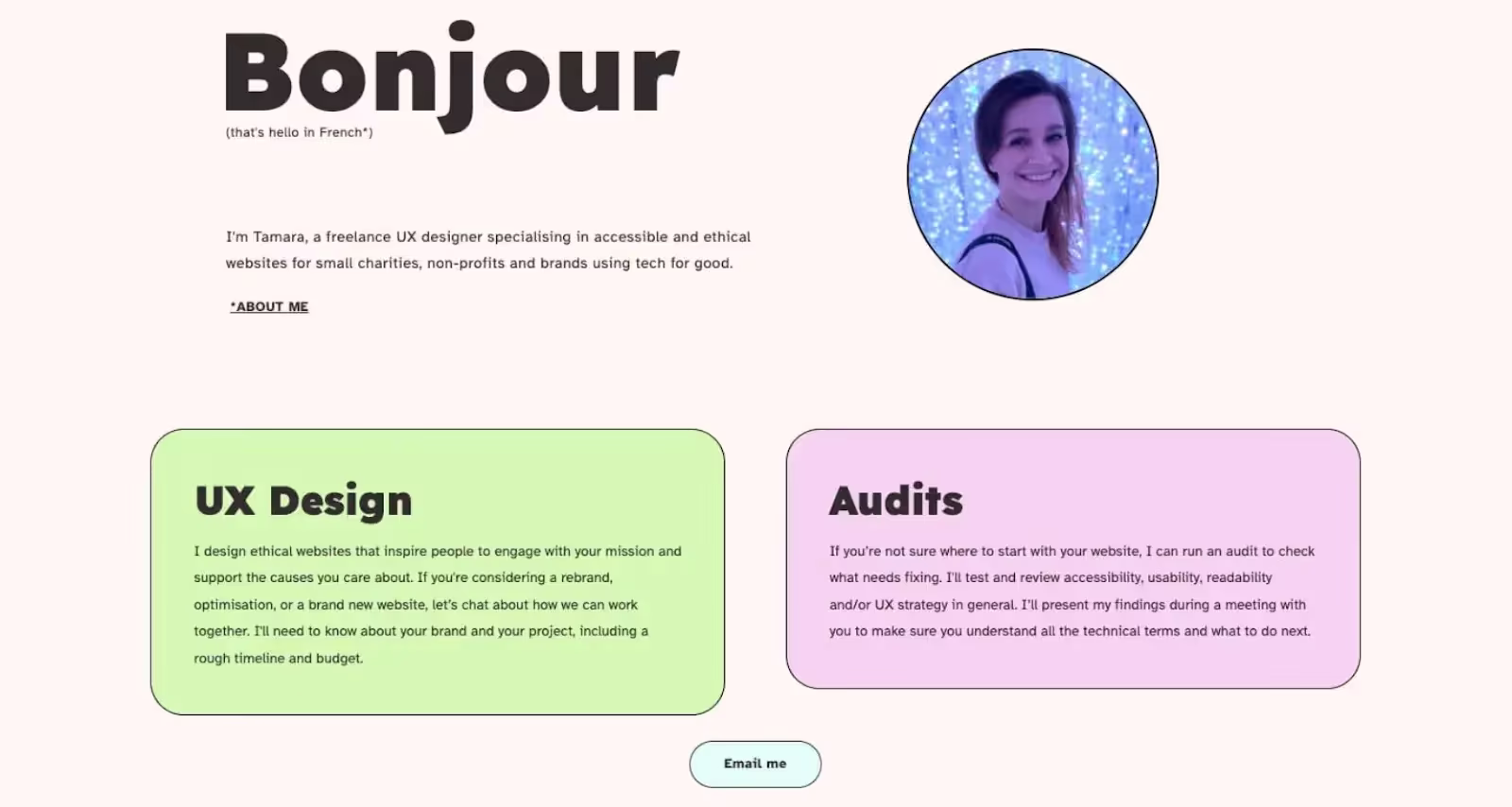Тамара Средоевич — UX-дизайнер, ориентированный на этичный дизайн, доступность и инклюзивность. Ее простой двухстраничный веб-сайт помимо своей непринужденной атмосферы и приятной цветовой гаммы содержит информацию о типе проектов, за которые она обычно берется.