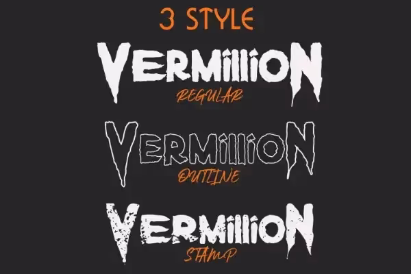 Шрифт Vermillion включает 3 интересных стиля, которые идеально подойдут для создания смелого и драматичного дизайна. Буквы выглядят небрежно, имеют рваные края.