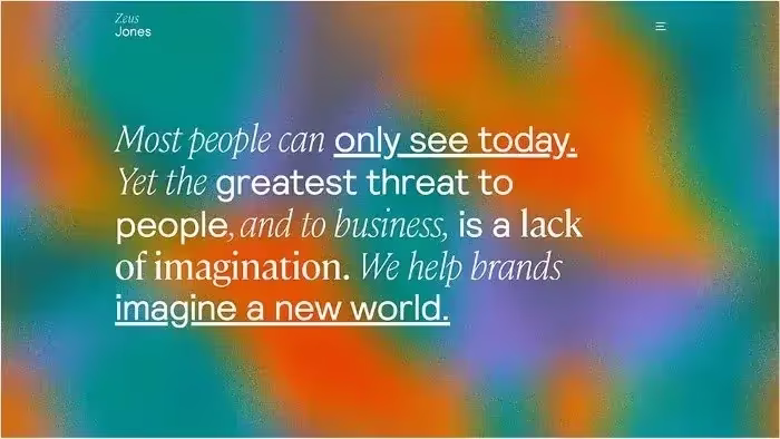 Zeus Jones — дизайн-студия, которая расположена в Милане. Их главная страница начинается с текста “Большинство людей видят только реальность.” на простом черном фоне. Если вы подождете несколько секунд, то увидите на странице больше текста, а фон станет похож на беспокойное море черных и серых оттенков. В конце на экране появится предложение “Мы помогаем брендам придумать новый мир”, а фон по нарастающей будет превращаться в красочный анимированный градиент синего, фиолетового, желтого и оранжевого оттенков. Градация цветов дополняет текстовое содержание и подчеркивает мощный посыл студии. Эта яркая заставка с самого начала приковывает внимание и пробуждает в посетителях сайта желание узнать больше о Zeus Jones.