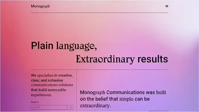 На всех страницах веб-сайта Monograph Communications можно увидеть фоновый градиент. Эстетическая привлекательность сайта приглашает пользователя узнать больше о бренде, который специализируется на коммуникационных решениях. На каждой странице можно увидеть разные цвета градиента: от фуксии до нежно-розового, от оранжевого и желтого до зеленого лайма и от лазурного до пурпурного. На сайте представлена интересная типографика и показаны линии сетки. Несмотря на отсутствие визуальных элементов, живость градиентов и контрастирующий контент черного цвета создают захватывающий эффект, который стимулирует посетителей к дальнейшему изучению сайта.