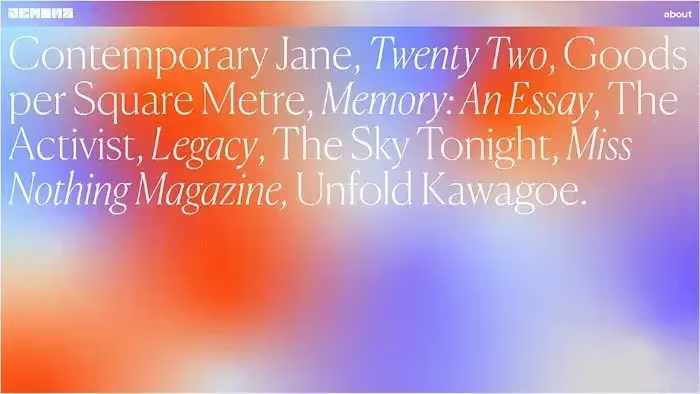 Jemima — графический дизайнер. Она специализируется на полиграфическом и книжном дизайне. На ее сайте портфолио представлено сочетание завораживающего, преимущественно синего и оранжевого зернистого градиента с белой типографикой. На главной странице написаны только названия проектов. При клике на название вы попадаете на отдельную страницу проекта с зернистым градиентным голубым фоном. Живость и многоцветность изображений не противоречит наличию градиента. Чтобы пользователям было легко воспринимать контент, фотографии размещены на однотонном фоне. Он отделяет изображения от градиента. Таким образом, цвета градиента и цвета на фотографиях не конфликтуют, а ее работа становится центром внимания зрителей.