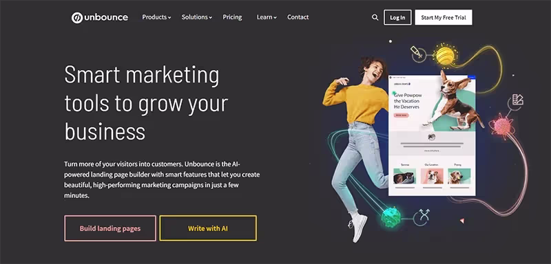 Unbounce использует темно-серый фон на первом экране своей главной страницы. Красочное изображение и кнопки с ярким текстом и обводками выделяются на темном фоне. Ниже и на других страницах мы можем увидеть более светлые оттенки серого и другие нейтральные цвета.