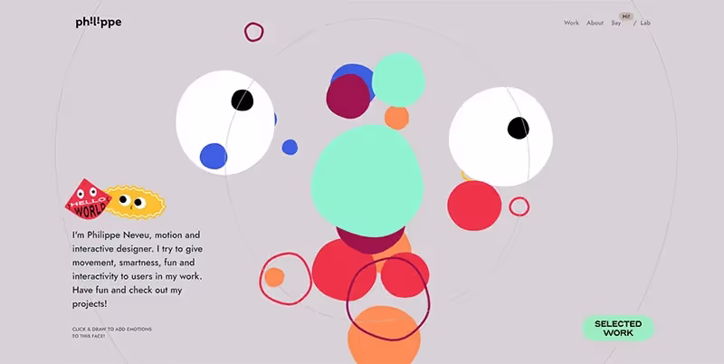 Перед нами интерактивный сайт-портфолио моушн-дизайнера, наполненный движением и анимационными эффектами. Хотя для фона был выбран серый цвет, интерфейс изобилует разноцветными элементами.