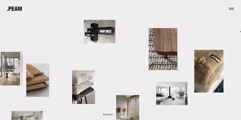 Сайт PEAM наполнен изображениями: здесь представлено множество красивых фотографий из портфолио продуктового дизайнера. В данном случае серый фон — прекрасный выбор, поскольку он немного отличается от стандартного белого фона и при этом позволяет сделать акцент на фотографиях.