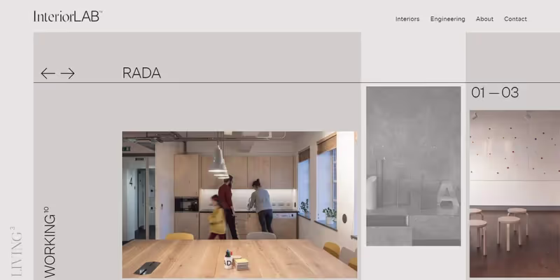 InteriorLAB — еще один корпоративный сайт, выполненный в нейтральной серой цветовой гамме. Для просмотра проектов компании предусмотрена горизонтальная прокрутка. Как и следовало ожидать от фирмы, занимающейся дизайном интерьеров, здесь представлено множество больших красивых фотографий.