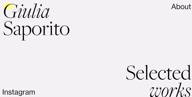 Сайт Джулии Сапорито имеет светло-серый фон. В дизайне то тут, то там встречаются небольшие всплески цвета. Особого внимания заслуживает футер с желтым фоном. Разумеется, портфолио также содержит красочные изображения.