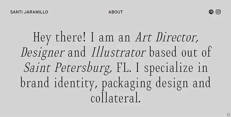 Да, фон главной страницы портфолио Санти Харамильо действительно серый, но, прокрутив страницу вниз, вы увидите множество ярких и красочных изображений. На странице "Обо мне" фон вместо серого становится ярко-синим.