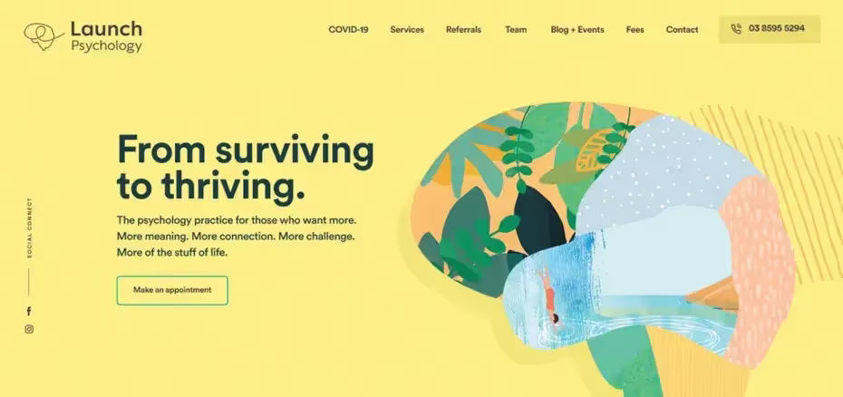 Хотя эти стандартные подходы неизбежно становятся привычными, они не обязательно должны быть скучными. Есть способы сделать эти макеты интересными и неожиданными с помощью смелого использования цвета или образов. Например, Launch Psychology использует креативные, красочные фоны для каждого раздела, которые придают стандартным макетам свежесть.