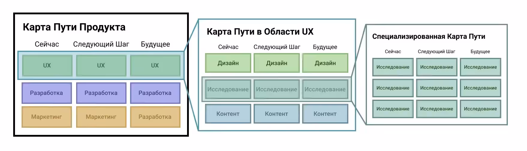 - Руководители или старшие UX-специалисты (любой области) могут создавать специализированные карты пути. Они описывают сферу ответственности их команды в отношении конкретной области UX.
