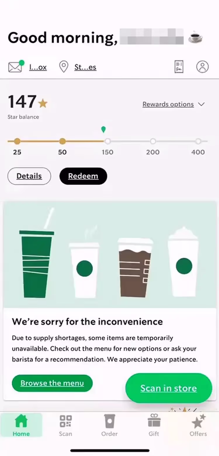 ❌ «Где, черт возьми, мой предыдущий заказ? Мне всегда трудно найти его…». Пользователь является постоянным клиентом Starbucks. В мобильном приложении он скроллил главную страницу вниз и вверх, но не смог функцию, с помощью которой можно повторить предыдущий заказ. Когда у пользователей есть любимые блюда, их отсутствие в прямой видимости затрудняет совершение целевого действия.